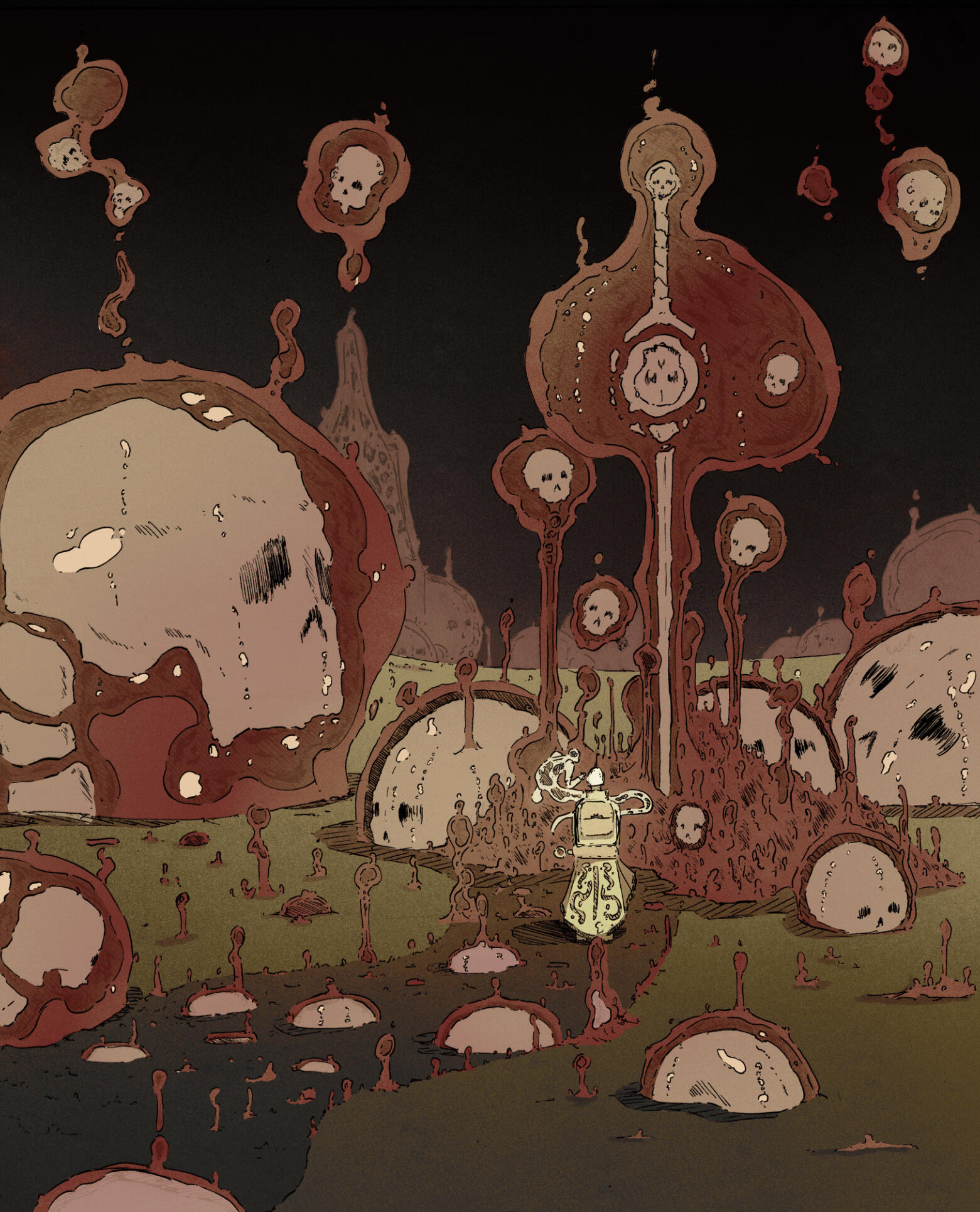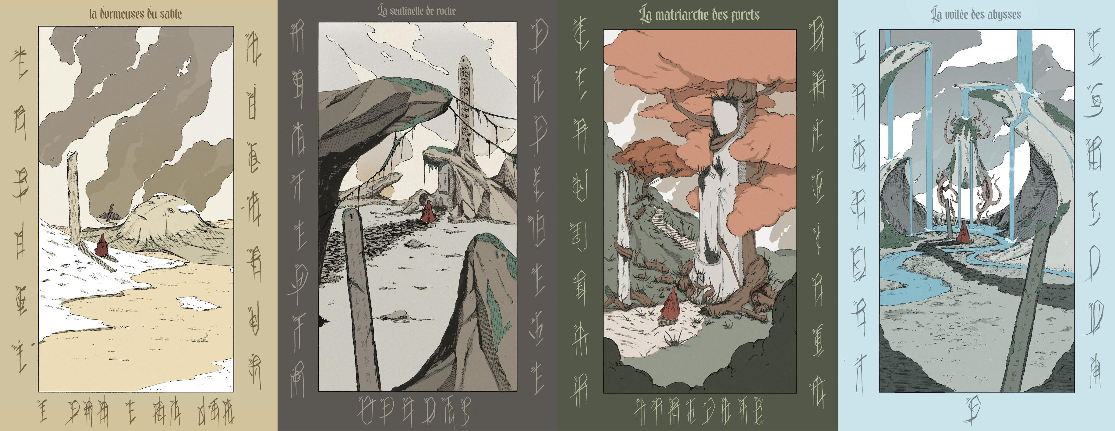 Cette série de quatre illustrations montre le voyage d’un personnage à travers différents sanctuaires qu’il visite et explore.