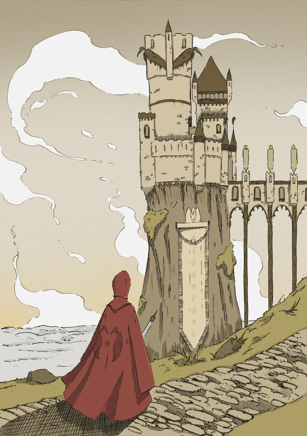 Cette série de quatre illustrations montre le voyage d’un personnage à travers différents sanctuaires qu’il visite et explore.
